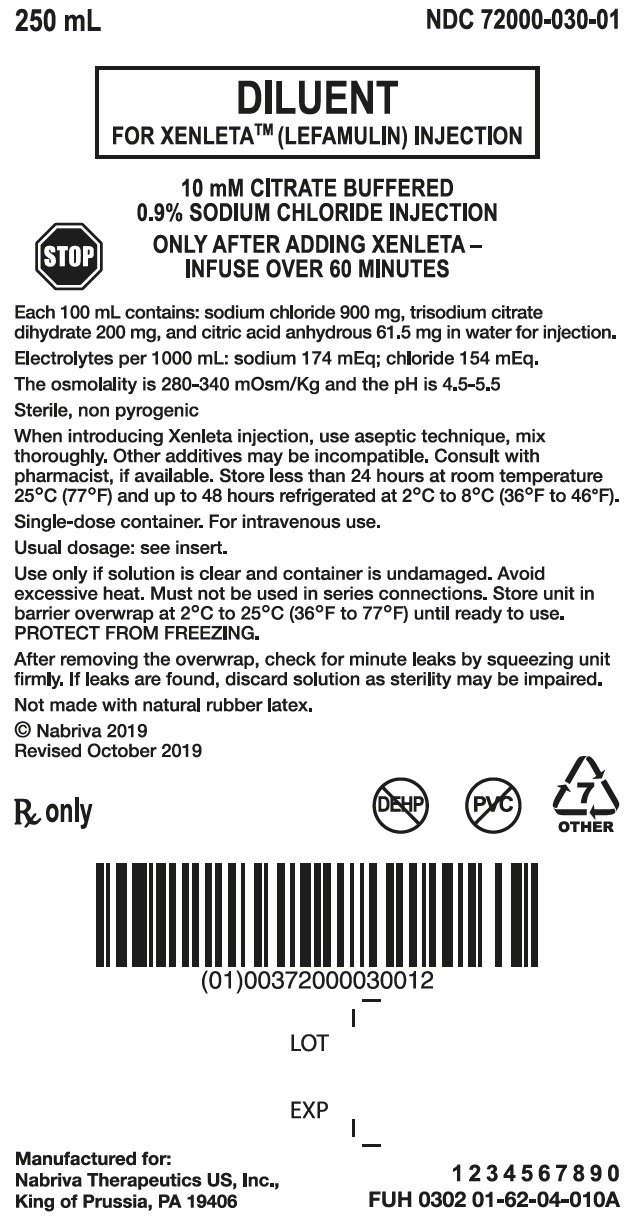 XENLETA Injection must be diluted with the diluent supplied with XENLETA Injection, before administration by intravenous infusion. Each supplied diluent infusion bag contains 250 mL of 10 mM citrate buffered (pH 5) 0.9% sodium chloride. The diluent is a clear, colorless solution. The inactive ingredients are citric acid anhydrous, sodium chloride, trisodium citrate dihydrate, and water for injection. Each 100 mL contains: sodium chloride 900 mg, trisodium citrate dihydrate 200 mg, and citric acid anhydrous 61.5 mg in water for injection. Electrolytes per 1000 mL: sodium 174 mEq; chloride 154 mEq. The osmolality is 280-340 mOsm/kg and the pH is 4.5-5.5.