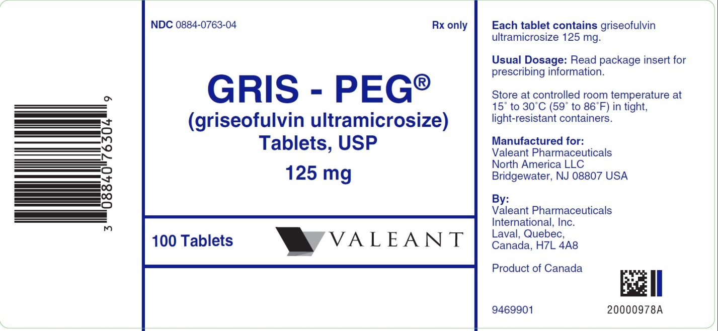 Gris-PEG® (griseofulvin ultramicrosize) Tablets, 125 mg, white scored, elliptical-shaped, embossed “Gris-PEG” on one side and “125” on the other. The 125 mg strength is film-coated and is available in bottles of 100 (NDC 0884-0763-04).