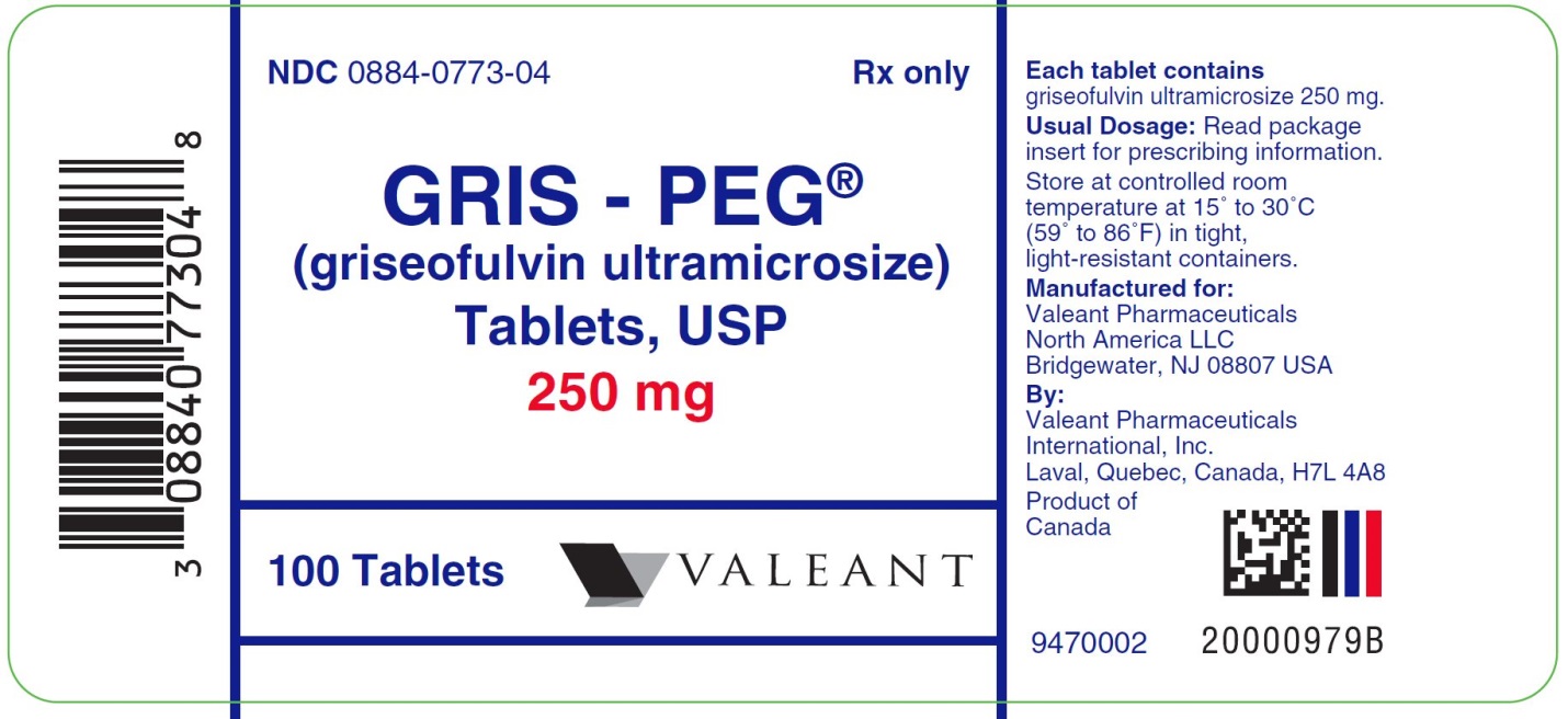 Gris-PEG (griseofulvin ultramicrosize) Tablets, 250 mg, white scored, capsule-shaped, embossed “Gris-PEG” on one side and “250” on the other. The 250 mg strength is film-coated and is available in bottles of 100 (NDC 0884-0773-04).