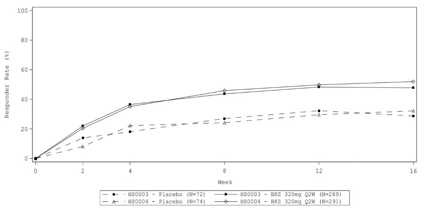 During the two 16-week, placebo-controlled periods of Trials HS-1 and HS-2, higher rates of suicidal ideation as assessed by C-SSRS were reported in BIMZELX-treated subjects than in subjects receiving placebo. Based on a pooled analysis of the first 16 weeks of the placebo controlled clinical trials, 16/861 subjects in the BIMZELX group (1.9 %) reported suicidal ideation on the C-SSRS compared to 1/146 subjects in the placebo group (0.7%) with an estimated relative risk of 2.70 (95% confidence interval: 0.36, 20.12). Subjects without a prior history of SI/B treated with BIMZELX also reported a higher rate of new-onset suicidal ideation on the C-SSRS than subjects treated with placebo (0.9% vs. 0%). [see Adverse Reactions 6.1].