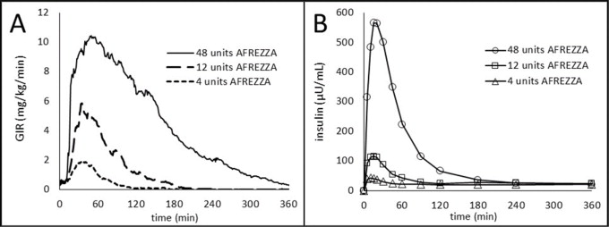 The time course of insulin action (i.e., glucose lowering) may vary considerably in different patients or within the same patient, or when switching from subcutaneous mealtime insulin to AFREZZA. The average pharmacodynamic profile [i.e., glucose lowering effect measured by glucose infusion rate (GIR) over time in a euglycemic clamp study] after administration of a single AFREZZA dose of 4, 12, and 48 units in 30 patients with type 1 diabetes is shown in Figure 2(A), and key characteristics regarding the timing of the effects are described in Table 5: