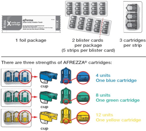 AFREZZA Inhalation Powder is a dry powder supplied as 4 unit, 8 unit or 12 unit cartridges.
