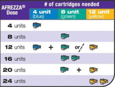 The cartridges are color-coded, blue for 4 units, green for 8 units and yellow for 12 units. Each cartridge is marked with “afrezza” and “4 units”, “8 units” or “12 units”.