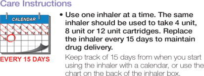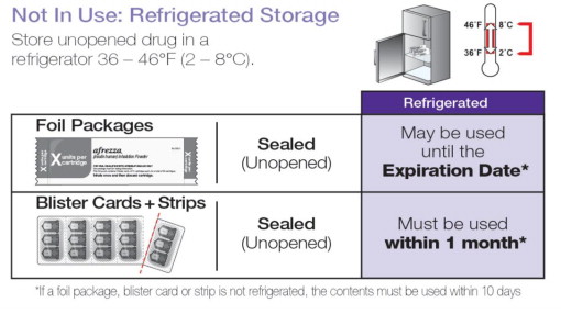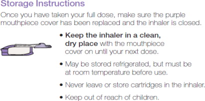 Store refrigerated or at room temperature 2ºC to 25ºC (36ºF to 77ºF); excursions permitted. Inhaler may be stored refrigerated, but should be at room temperature before use.