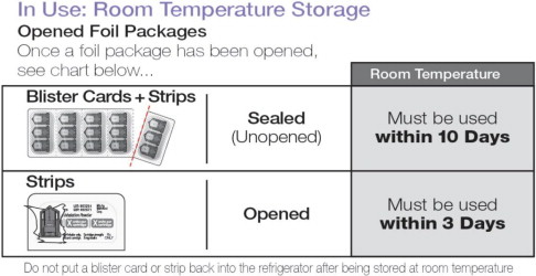 Do not put a blister card or strip back into the refrigerator after being stored at room temperature.