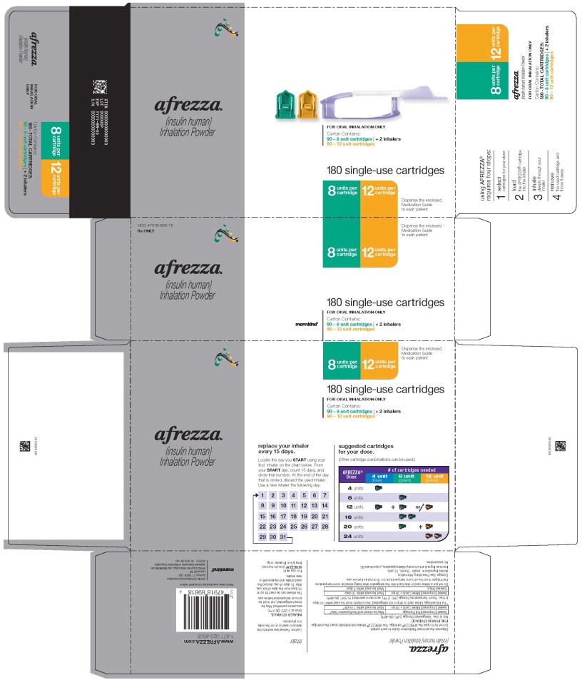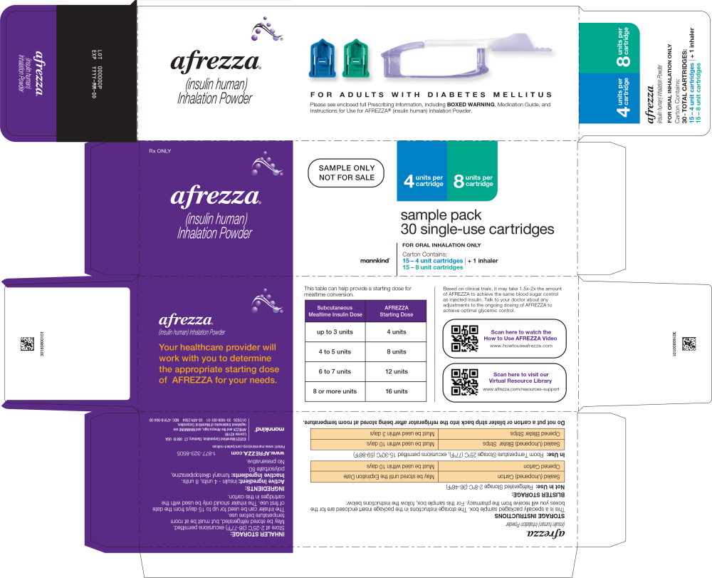 AFREZZA (insulin human) Inhalation Powder is available as 4 unit, 8 unit and 12 unit single-use cartridges. Three cartridges are contained in a single cavity of a blister strip. Each card contains 5 blister strips (each containing three cartridges) separated by perforations for a total of 15 cartridges. Two cards of the same cartridge strength are packaged in a foil laminate overwrap (30 cartridges per foil package).
