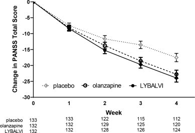 Compared with patients on placebo, a statistically significant improvement in the change from baseline in PANSS total score at Week 4 was observed in patients treated with LYBALVI (Table 7). The inclusion of samidorphan in LYBALVI did not appear to negatively impact the antipsychotic efficacy of olanzapine.