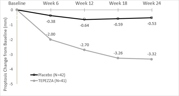 In Study 2, improvement of proptosis as measured by mean change from Baseline was observed as early as 6 weeks and continued to improve through week 24 as shown in Figure 1. Similar results were seen in Study 1.