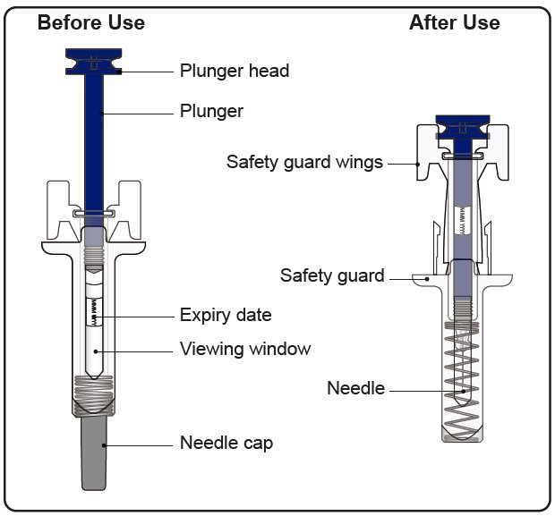 Immediately dispose of the syringe and needle cap in the nearest sharps container. Do not put the needle cap back on the used syringe.