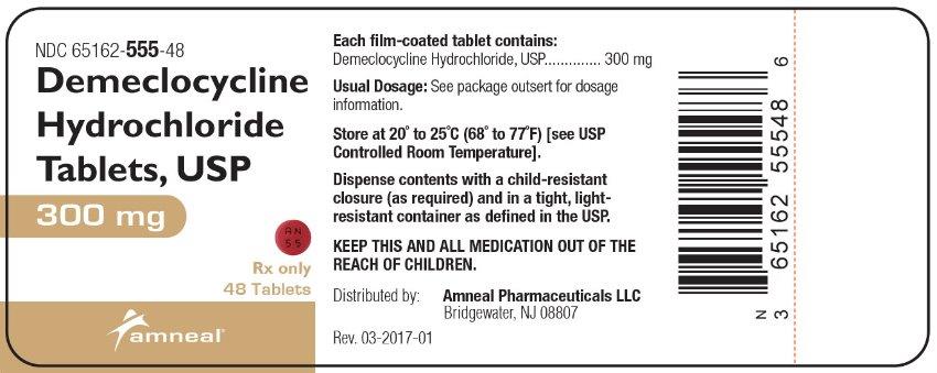 Demeclocycline HCl tablets, USP, 300 mg, are supplied as round, convex, red, film-coated tablets, debossed with “AN” above “55” on one side and plain on the other side.