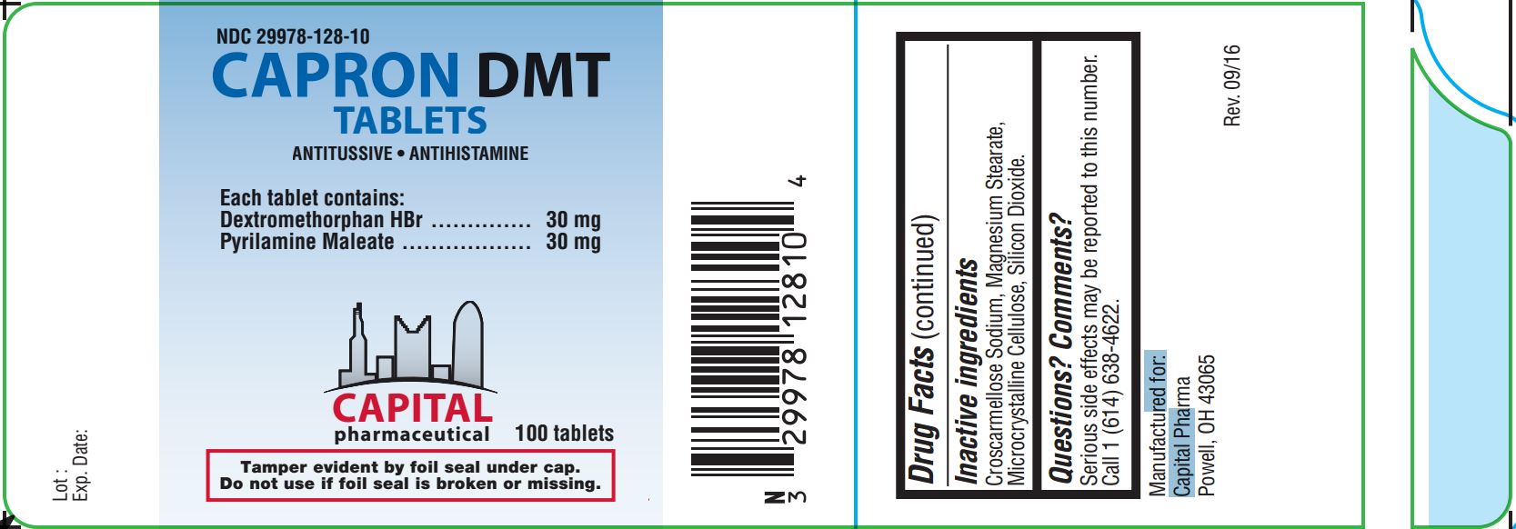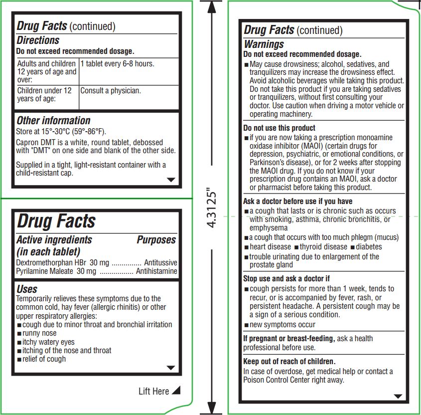 Capron DMT is a white, round tablet, debossed with "DMT" on one side and blank of the other side.