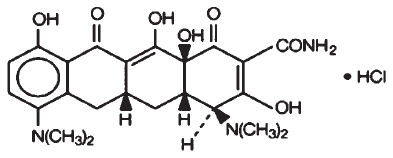 Minocycline hydrochloride, a semi synthetic derivative of tetracycline, is [4S (4α,4aα,5aα,12aα)]-4,7-Bis(dimethylamino)-1,4,4a,5,5a,6,11,12a-octahydro-3,10,12,12a tetrahydroxy-1,11-dioxo-2-naphthacenecarboxamide mono hydrochloride. The structural formula is representated below: