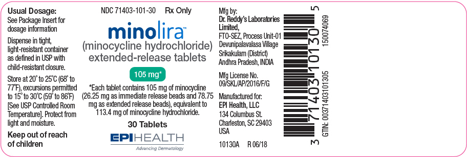 The 105 mg extended-release tablets are white to off-white, rectangular, with brown or gold color speckles. The tablets have a single score line on both surfaces and are debossed with ‘M1’ on one surface. On the face with debossing, ‘M’ and ‘1’ are on either side of the score line. Each tablet contains 26.25 mg of minocycline as immediate release beads and 78.75 mg of minocycline as extended release beads. The 105 mg tablets are supplied as follows: