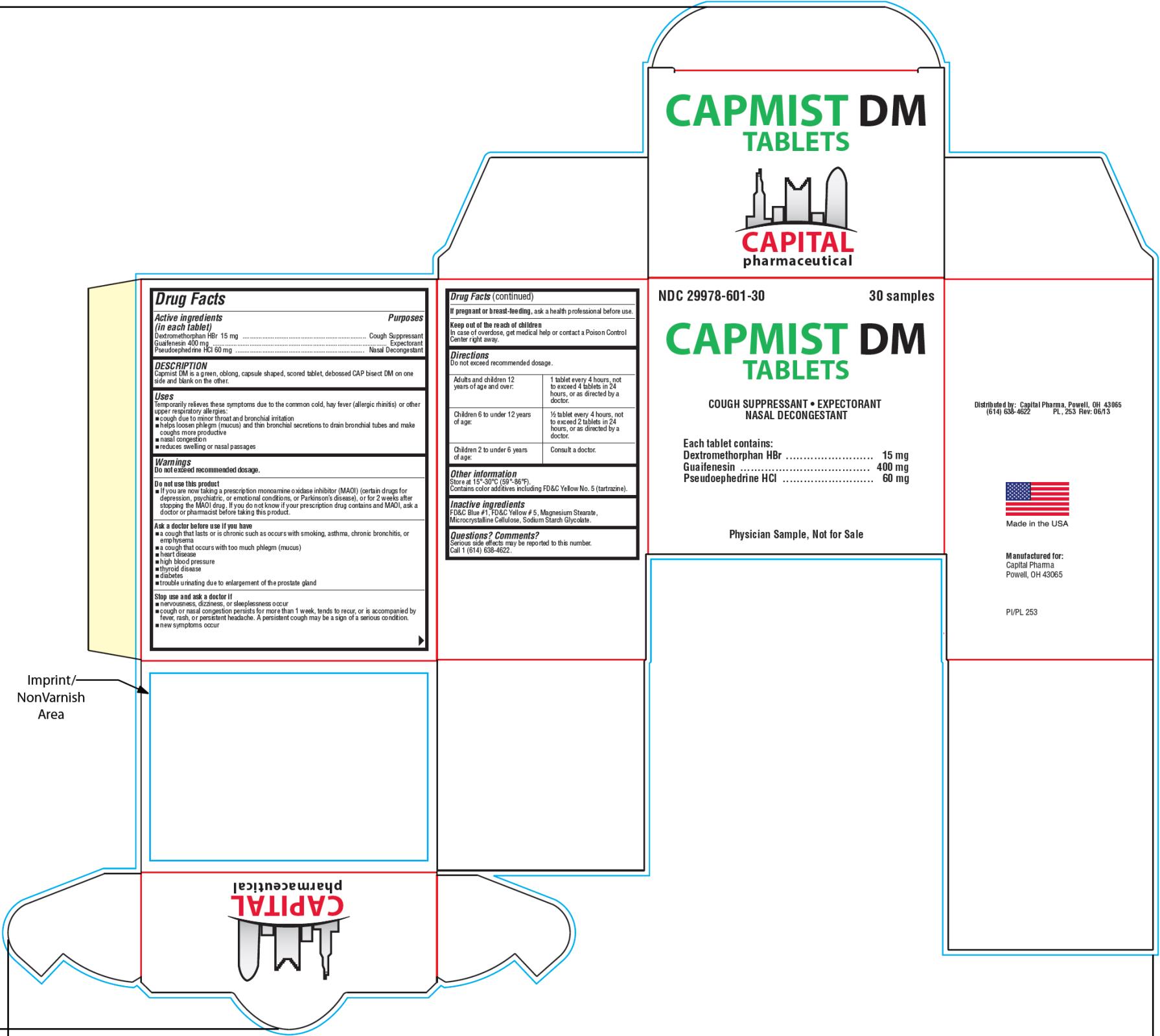 Capmist DM is a light green, oblong, capsule shaped, scored tablet, debossed “CAP” bisect “DM” on one side and blank on the other.