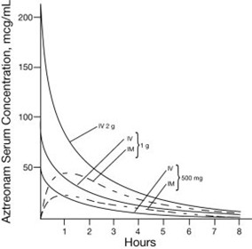 Serum concentrations of aztreonam in healthy subjects following completion of single intramuscular injections of 500 mg and 1 g doses are depicted in Figure 1; maximum serum concentrations occur at about 1 hour. After identical single intravenous or intramuscular doses of AZACTAM, the serum concentrations of aztreonam are comparable at 1 hour (1.5 hours from start of intravenous infusion) with similar slopes of serum concentrations thereafter.