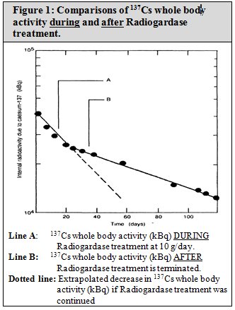 In a 1987 incident in Goiânia, Brazil, 46 patients with heavy internal contamination with 137Cs were treated with Radiogardase (Table 2). Data on the whole body effective half-life of 137Cs, during and after Radiogardase treatment, was completed on 33 of these 46 patients (see Table 2). Radiogardase reduced the mean whole-body effective half-life of 137Cs by 69%, 46%, and 43% in adults, adolescents, and younger children, respectively.