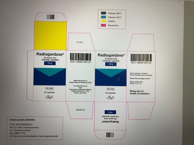 Radiogardase is supplied as gelatin capsules containing 0.5 grams of prussian blue insoluble for oral administration. The dark blue capsule is imprinted with the light blue inscription: