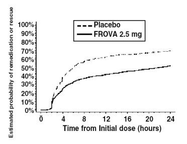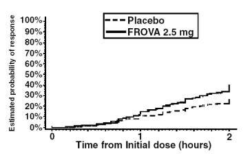 Figure 1 shows a Kaplan-Meier plot of the probability over time of obtaining headache response (no or mild pain) following treatment with FROVA 2.5 mg or placebo. The probabilities displayed are based on pooled data from the four placebo-controlled trials described in Table 2. Patients who did not achieve a response were censored at 24 hours.