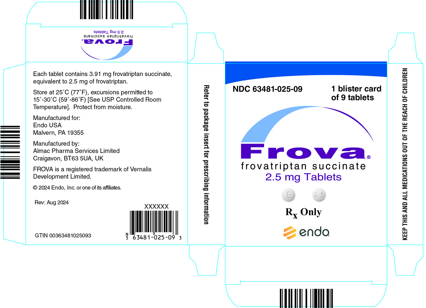 FROVA tablets, containing 2.5 mg of frovatriptan (base) as the succinate salt, are available as round, white, film-coated tablets debossed with 2.5 on one side and “E” on the other side. The tablets are available in: