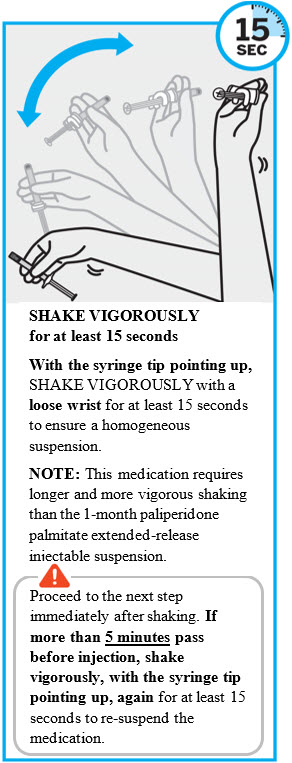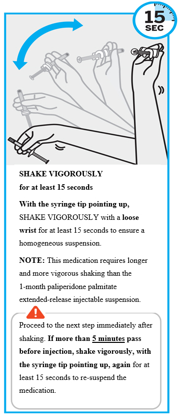 INVEGA TRINZA requires longer and more vigorous shaking than INVEGA SUSTENNA (1-month paliperidone palmitate extended-release injectable suspension). Shake the syringe vigorously, with the syringe tip pointing up, for at least 15 seconds within 5 minutes prior to administration (see Step 2).