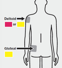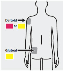 Administer into the center of the deltoid muscle. Deltoid injections should be alternated between the two deltoid muscles.