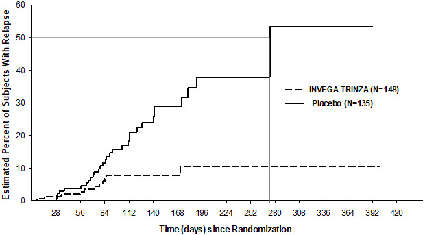 Twenty-three percent (23%) of patients in the placebo group and 7.4% of patients in the INVEGA TRINZA group experienced a relapse event. The time to relapse was statistically significantly longer in patients randomized to the INVEGA TRINZA group than compared to placebo-treated patients. A Kaplan-Meier plot of time to relapse by treatment group is shown in Figure 4.
