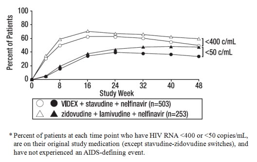 Study AI454-148 was a randomized, open-label, multicenter study comparing treatment with VIDEX (400 mg once daily) plus stavudine (40 mg twice daily) and nelfinavir (750 mg three times daily) versus zidovudine (300 mg twice daily) plus lamivudine (150 mg twice daily) and nelfinavir (750 mg three times daily) in 756 treatment-naive patients, with a median CD4 cell count of 340 cells per mm3 (range 80 to 1568 cells per mm3) and a median plasma HIV-1 RNA of 4.69 log10 copies per mL (range 2.6 to 5.9 log10 copies per mL) at baseline. Median CD4 cell count increases at 48 weeks were 188 cells per mm3 in both treatment groups. Treatment response and outcomes through 48 weeks are shown in Figure 1 and Table 14.