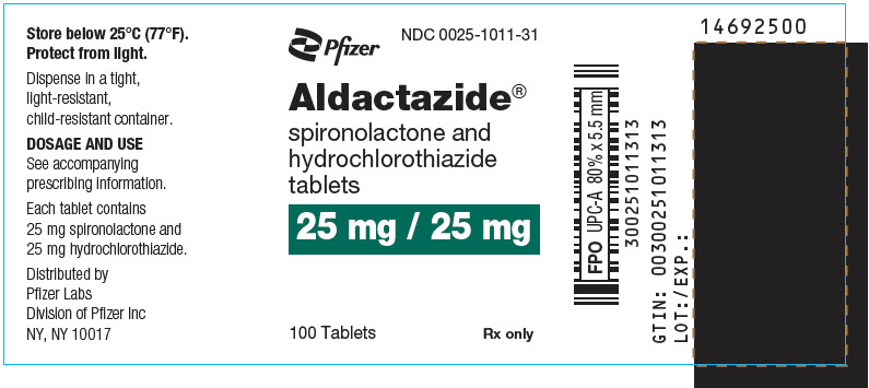 ALDACTAZIDE tablets containing 25 mg of spironolactone (ALDACTONE) and 25 mg of hydrochlorothiazide are round, tan, film coated, with SEARLE and 1011 debossed on one side and ALDACTAZIDE and 25 on the other side, supplied as: