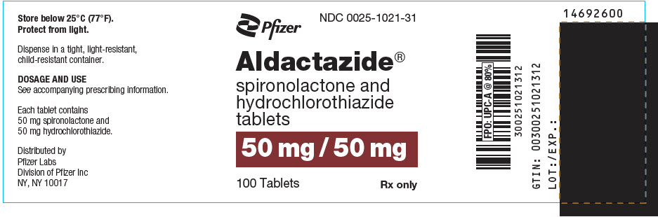 ALDACTAZIDE tablets containing 50 mg of spironolactone (ALDACTONE) and 50 mg of hydrochlorothiazide are oblong, tan, scored, film coated, with SEARLE and 1021 debossed on the scored side and ALDACTAZIDE and 50 on the other side, supplied as: