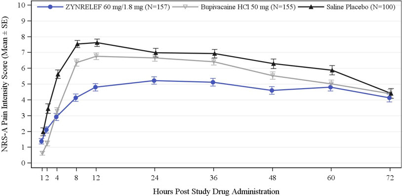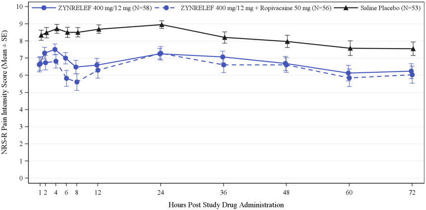 The safety of ZYNRELEF has been evaluated in a total of 1627 patients undergoing various surgical procedures across 14 clinical studies including 7 randomized, double-blind, bupivacaine- and placebo-controlled and saline placebo-controlled studies designed to investigate ZYNRELEF to reduce postoperative pain for 72 hours and the need for opioid analgesics, of whom 1183 received ZYNRELEF by instillation. Patients treated with ZYNRELEF ranged in age from 18 to 85 years (median age 51 years), with 53.0% female, 82.1% White, 13.7% African-American, and 4.3% all other races.