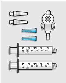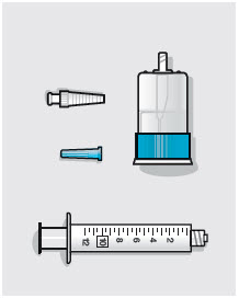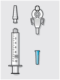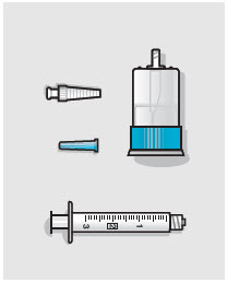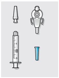 It is recommended that a 2-person team prepare this product: one sterile person and one non-sterile person. If product is prepared in advance of surgery, blue syringe tip cap ➍ may be used to cap the syringe until ready for application. Before administration, remove the blue syringe tip cap and attach the Luer lock applicator ➌.