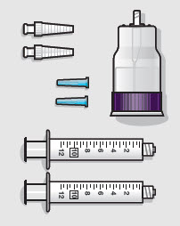 It is recommended that a 2-person team prepare this product: one sterile person and one non-sterile person. If product is prepared in advance of surgery, a blue syringe tip cap ➍ may be used to cap the syringe until ready for application. Before administration, remove the blue syringe tip cap and attach the Luer lock applicator ➌.
