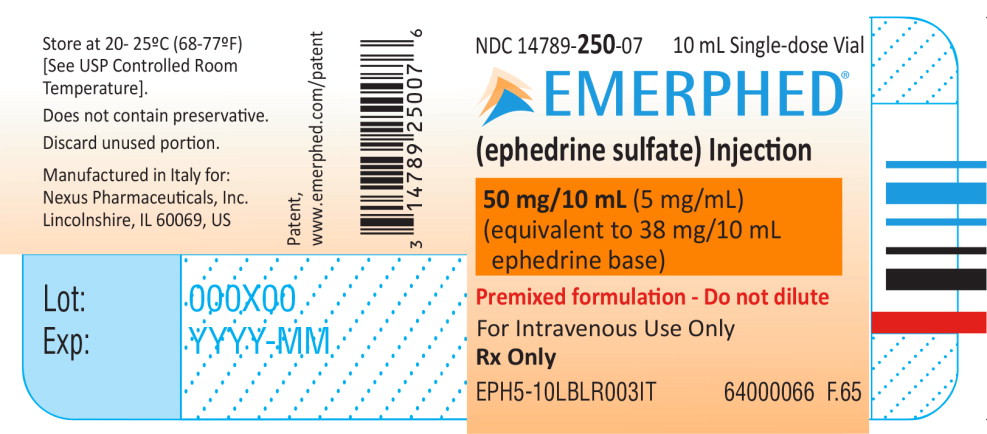 EMERPHED (ephedrine sulfate) injection is a clear, colorless solution available as a single-dose vial that contains 50 mg/10 mL ephedrine sulfate, equivalent to 38 mg/10 mL ephedrine base (5 mg/mL ephedrine sulfate, equivalent to 3.8 mg/mL ephedrine base) and is supplied as follows: