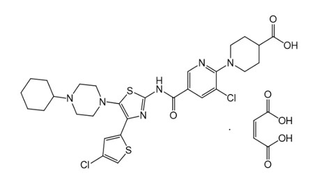 The active ingredient in DOPTELET is avatrombopag maleate, a thrombopoietin receptor agonist. The chemical name of avatrombopag maleate is 4-piperidinecarboxylic acid, 1-[3-chloro-5-[[[4-(4-chloro-2-thienyl)-5-(4-cyclohexyl-1-piperazinyl)-2-thiazolyl]amino]carbonyl]-2-pyridinyl]-, (2Z)-2-butenedioate (1:1). It has the molecular formula C29H34Cl2N6O3S2 · C4H4O4. The molecular weight is 765.73.