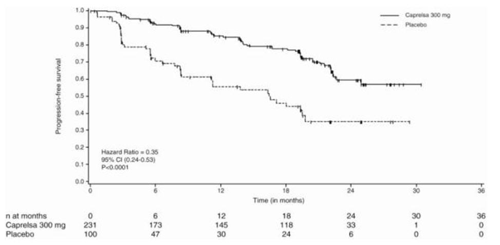 The major efficacy outcome measure was progression-free survival (PFS) with CAPRELSA compared to placebo. Other efficacy outcome measures included evaluation of overall survival (OS) and overall objective response rate (ORR). Centralized, independent blinded review of the imaging data was used in the assessment of PFS and ORR. Upon objective disease progression based on the investigator's assessment, patients were discontinued from blinded study treatment and given the option to receive open-label CAPRELSA. Forty-seven percent (109/231) of the patients initially randomized to CAPRELSA opted to receive open-label CAPRELSA after disease progression, and 79% (79/100) of the patients initially randomized to placebo opted to receive open-label CAPRELSA after disease progression.