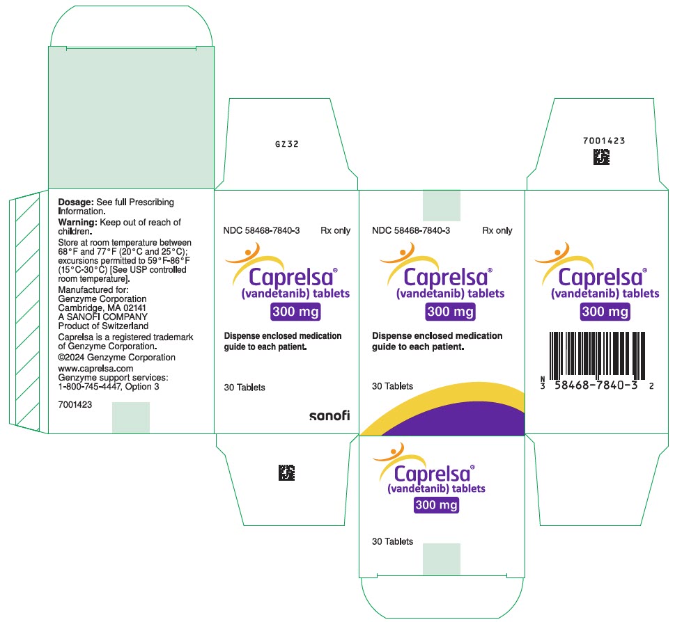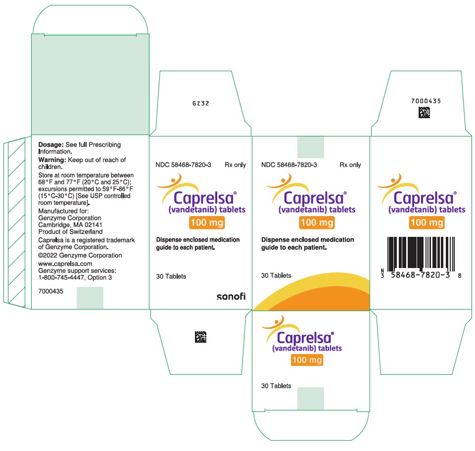 CAPRELSA tablets for daily oral administration are available in two dosage strengths containing either 100 mg or 300 mg of vandetanib. The tablet cores contain the following inactive ingredients: calcium hydrogen phosphate dihydrate, crospovidone, magnesium stearate, microcrystalline cellulose, and povidone. The tablet film-coat contains the following inactive ingredients: hypromellose 2910, macrogol 300, and titanium dioxide E171.