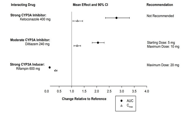 The effects of other drugs on the pharmacokinetics of suvorexant are presented in Figure 1 as change relative to suvorexant administered alone (test/reference). Strong (e.g., ketoconazole or itraconazole) and moderate (e.g., diltiazem) CYP3A inhibitors significantly increased suvorexant exposure. Strong CYP3A inducers (e.g., rifampin) substantially decreased suvorexant exposure [see Drug Interactions (7.2)].