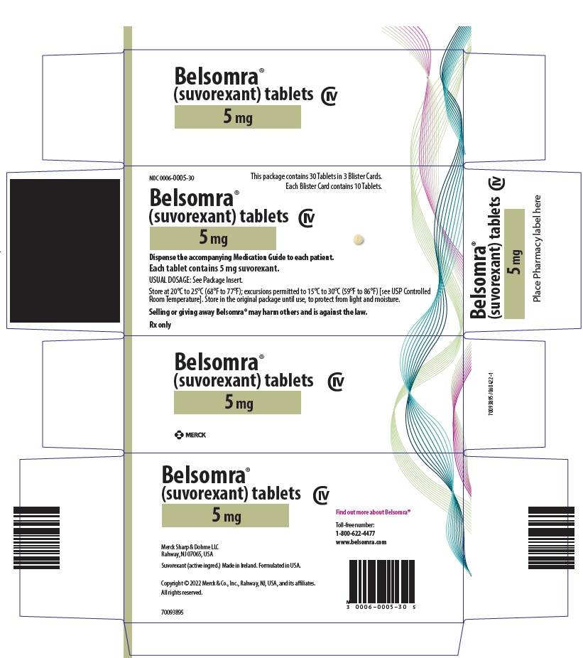 BELSOMRA tablets, 5 mg, are yellow, round, film-coated tablets, with "5" on one side and plain on the other side. They are supplied as follows: NDC 0006-0005-30 unit-of-use blisters of 30