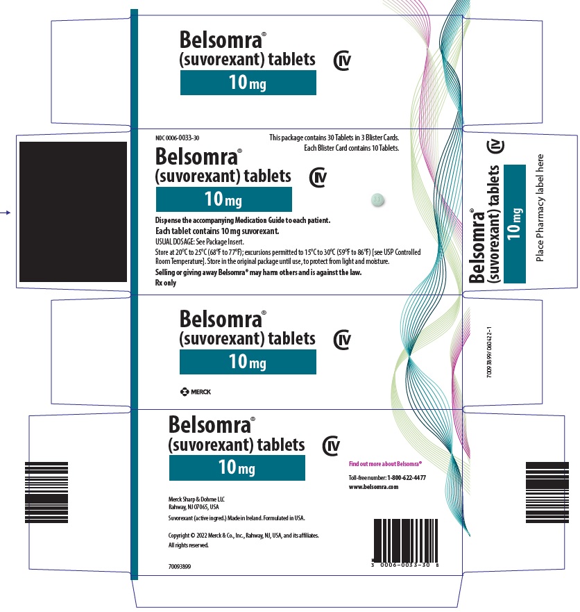 BELSOMRA tablets, 10 mg, are green, round, film-coated tablets, with "33" on one side and plain on the other side. They are supplied as follows: NDC 0006-0033-30 unit-of-use blisters of 30