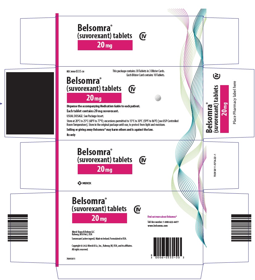 BELSOMRA tablets, 20 mg, are white, round, film-coated tablets with the corporate logo and "335" on one side and plain on the other side. They are supplied as follows: NDC 0006-0335-30 unit-of-use blisters of 30