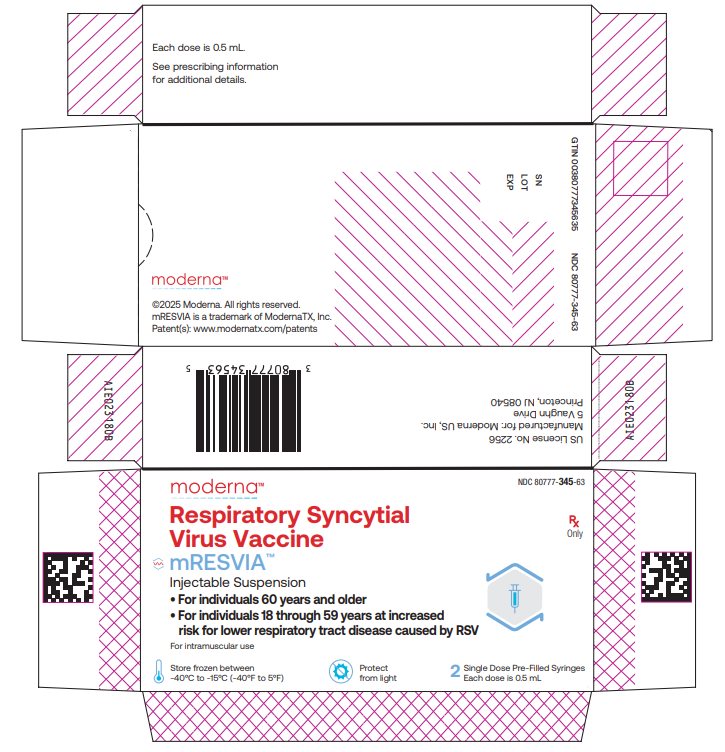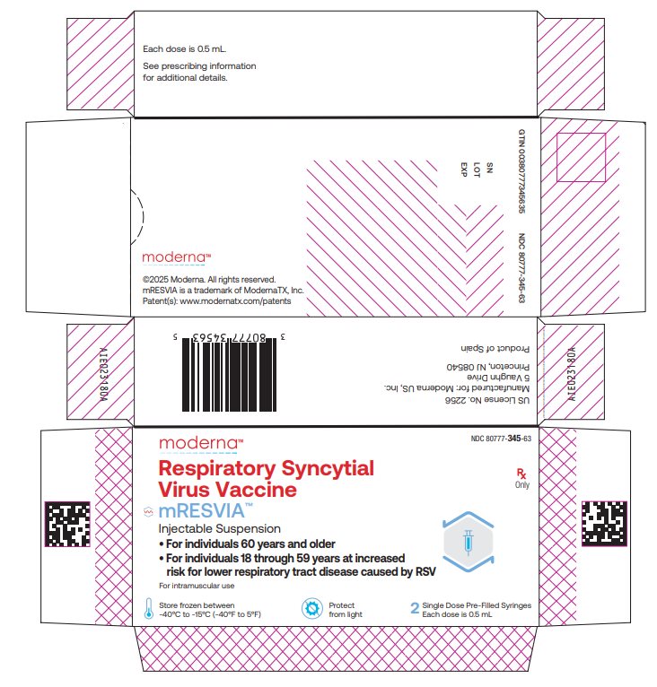 NDC 80777-345-63 Respiratory Syncytial Virus Vaccine mRESVIATM Injectable Suspension For individuals 60 years and older For individuals 18 through 59 years at increased