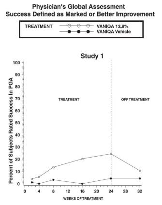 Two randomized double-blind studies involving 594 female patients (393 treated with VANIQA ® , 201 with vehicle) treated twice daily for up to 24 weeks evaluated the efficacy of VANIQA ® in the reduction of unwanted facial hair in women. Women in the trial had a customary frequency of removal of facial hair two or more times per week. Women with facial conditions such as severe inflammatory acne, women who were pregnant, and nursing mothers were excluded from the studies. Physicians assessed the improvement or worsening from the baseline condition (Physician's Global Assessment [PGA]), 48 hours after shaving, of all treated areas. Statistically significant improvement for VANIQA ® (eflornithine hydrochloride) cream, 13.9% versus vehicle was seen in each of these studies for "marked improvement" or greater response (24-week time point; p≤ 0.001). Marked improvement was seen consistently at 8 weeks after initiation of treatment and continued throughout the 24 weeks of treatment. Hair growth approached pretreatment levels within 8 weeks of treatment withdrawal. The success rate over time is graphically presented below for each pivotal trial.