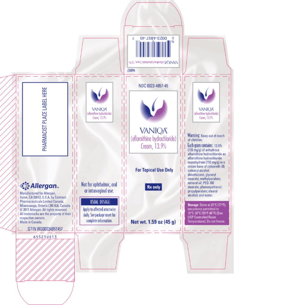 Apply a thin layer of VANIQA ® (eflornithine hydrochloride) cream, 13.9% to affected areas of the face and adjacent involved areas under the chin and rub in thoroughly. Do not wash treated area for at least 4 hours. Use twice daily at least 8 hours apart or as directed by a physician. The patient should continue to use hair removal techniques as needed in conjunction with VANIQA ® . (VANIQA ® should be applied at least 5 minutes after hair removal.) Cosmetics or sunscreens may be applied over treated areas after cream has dried.