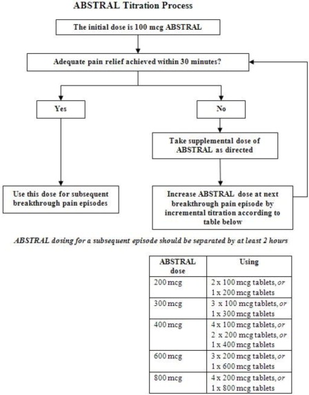 Titration Steps: If adequate analgesia was not obtained with the first 100 mcg dose, continue dose escalation in a stepwise manner over consecutive breakthrough episodes until adequate analgesia with tolerable side effects is achieved. Increase the dose by 100 mcg multiples up to 400 mcg as needed. If adequate analgesia is not obtained with a 400 mcg dose, the next titration step is 600 mcg. If adequate analgesia is not obtained with a 600 mcg dose, the next titration step is 800 mcg. During titration, patients can be instructed to use multiples of 100 mcg tablets and/or 200 mcg tablets for any single dose. Instruct patients not to use more than 4 tablets at one time. If adequate analgesia is not obtained 30 minutes after the use of ABSTRAL, the patient may repeat the same dose of ABSTRAL. No more than two doses of ABSTRAL may be used to treat an episode of breakthrough pain. Rescue medication as directed by the health care provider can be used if adequate analgesia is not achieved after use of ABSTRAL.