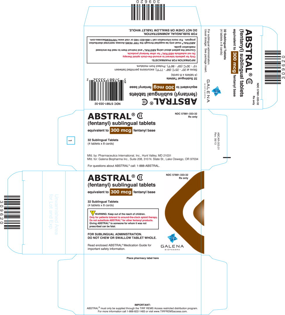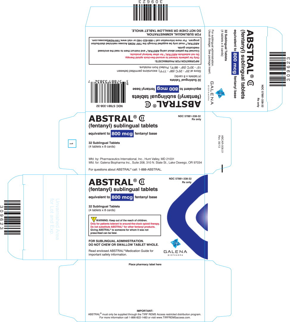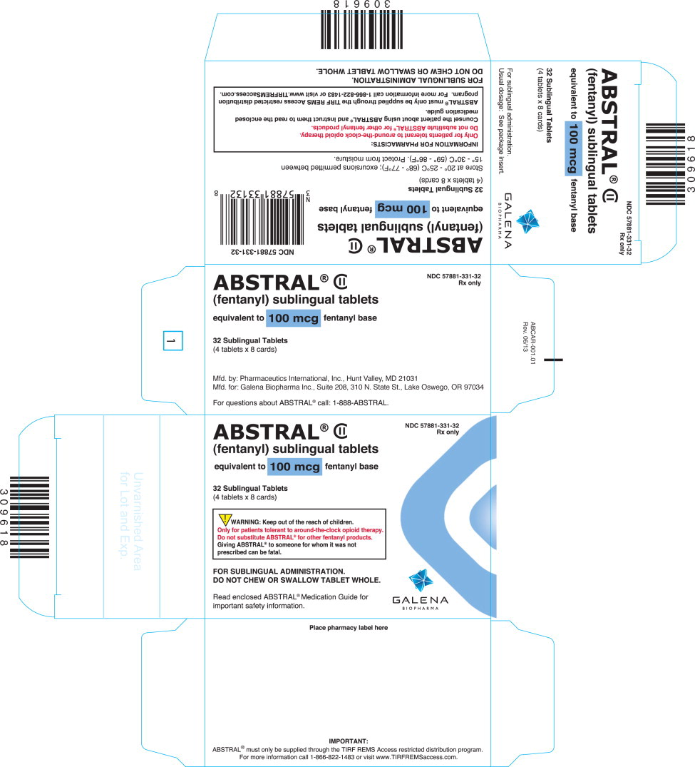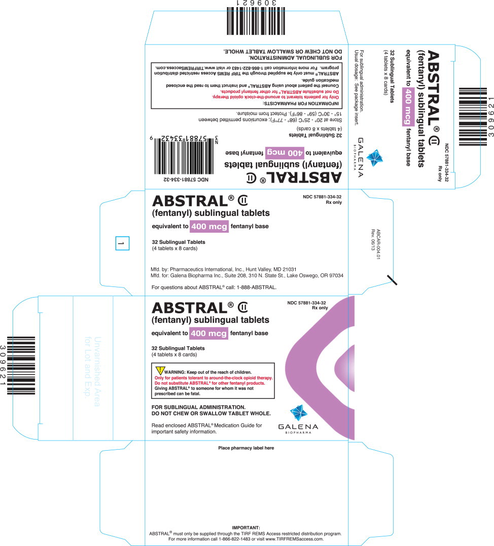 ABSTRAL is supplied in individually sealed child-resistant blister packages contained in a cardboard outer carton, in pack sizes of 12 (100 mcg, 200 mcg, 300 mcg and 400 mcg strengths) or 32 (all strengths) tablets. The packaging is color-coded for each ABSTRAL tablet strength.