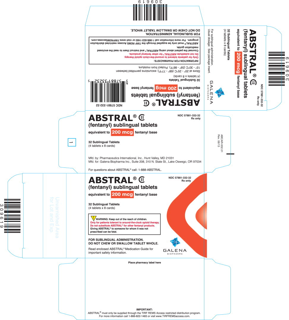 ABSTRAL is supplied in six dosage strengths. Tablets are supplied in child-resistant, protective blister cards with peelable foil. Each blister card contains 4 tablets, in pack sizes of 12 (100 mcg, 200 mcg, 300 mcg and 400 mcg strengths) or 32 (all strengths) tablets. Each tablet is white in color, with the strength distinguishable by the shape of the dosage unit and by de-bossing on the tablet surface: